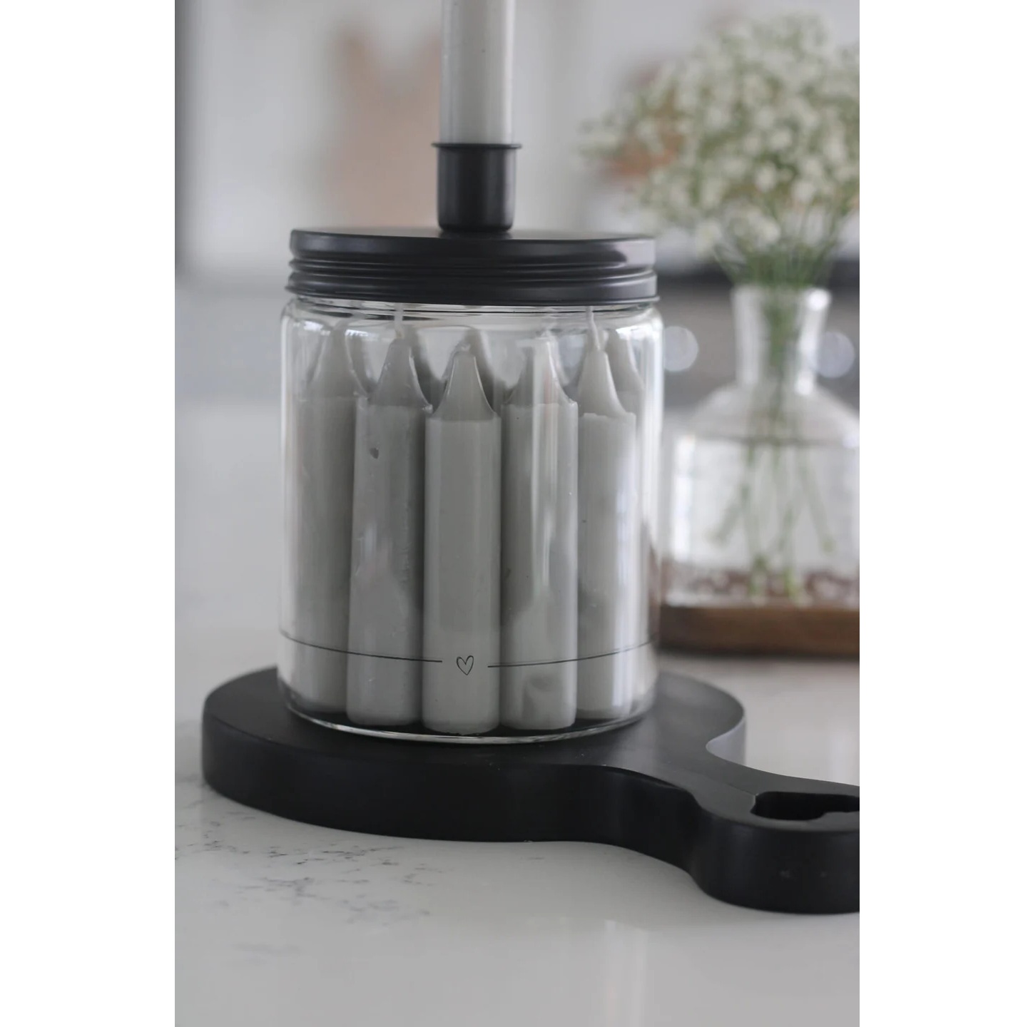 A beautifully simple glass candle holder , storage jar with a small tiny heart detail.