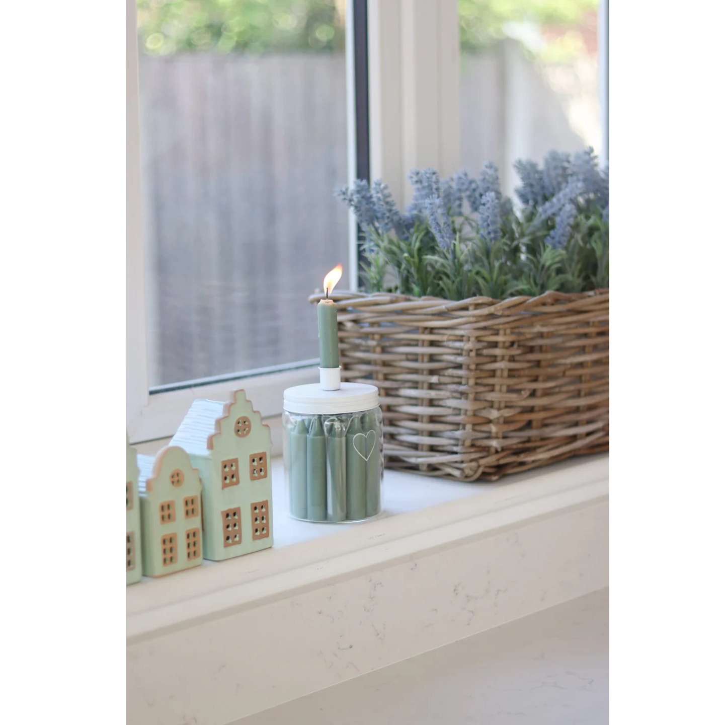 Our large Glass Candle holders come with a removable with a metal lid, simply lift the lid fill with your candles keeping everything organised. Style your candle holders with wooden trays or small stools to transform a small worktop space. If you wish for more impact we suggest using your favourite coffee table tray, a ceramic vase with faux flowers and your new glass candle holder to create a centre piece for your kitchen island or coffee table.